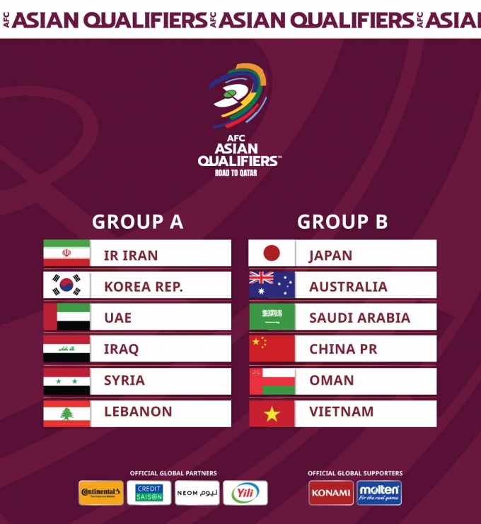 홈 앤드어웨이 방식으로 진행하며 각조 12위 팀은 본선으로 직행합니다. 그룹 A는 이란 대한민국 UAE 이라크 시리아.