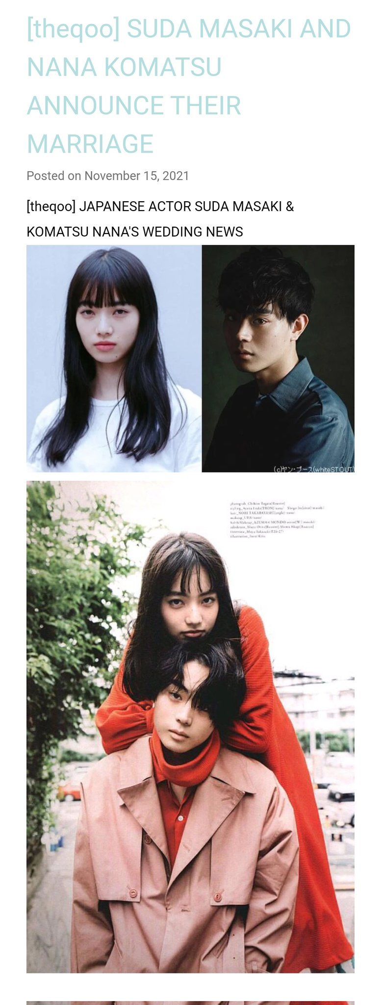 They ended their days of living in separate apartments and moved in together but in fact before this report came out and their love nest was surrounded by the entertainment media. I am pleased to announce that I Masaki Suda and Nana Komatsu have gotten married. A different news outlet reporter confirmed that Nana Komatsu and Masaki Suda are dating and claimed I did stake outs several times to report on Nana Komatsu and Masaki Suda Dating rumors.